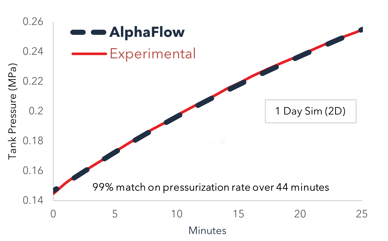 Pressurization rate: AlphaFlow reproduces the rate of tank pressurization with 99% accuracy over the full 44-minute period.